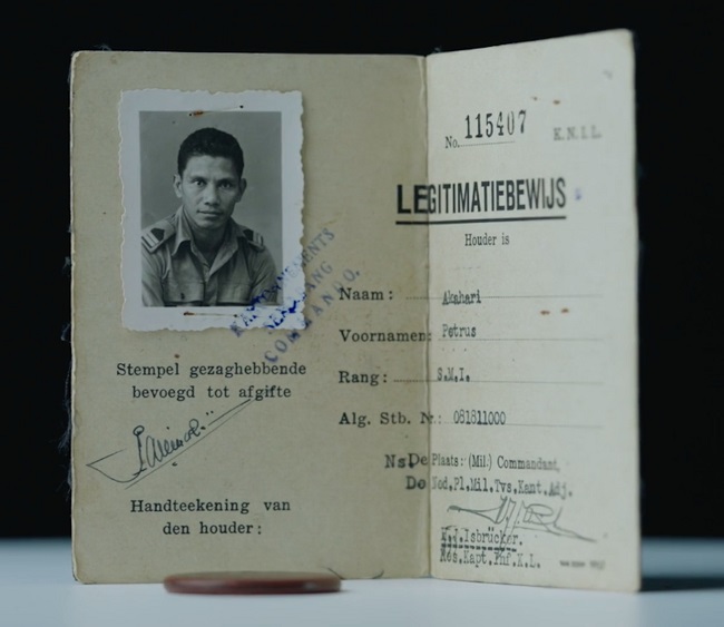 After his death in 2000, grandpa Akihary’s personal belongings came under the care of his daughter, my oldest aunt, Martha Anthony-Akihary. Grandpa instructed her to take good care of his personal belongings, which included some very interesting objects: photos of him in KNIL uniform, military awards, decorations, a KNIL identity card and a metal body tag with a studbook number stamped into it. I wanted to include the last two objects in the exhibition to accompany my grandfather’s story.