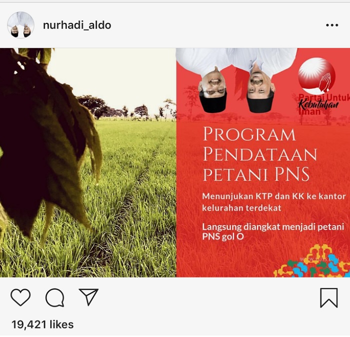 Some of these activists produced campaign poster memes as if they were Dildo party candidates, including short but witty programs. One proposed palm oil plantations be converted to marijuana fields, as part of a legalisation push. Another proposed appointing farmers as civil servants. But other Nurhadi-Aldo party programs have been sexist, such as ‘training for women to use their indicators’.