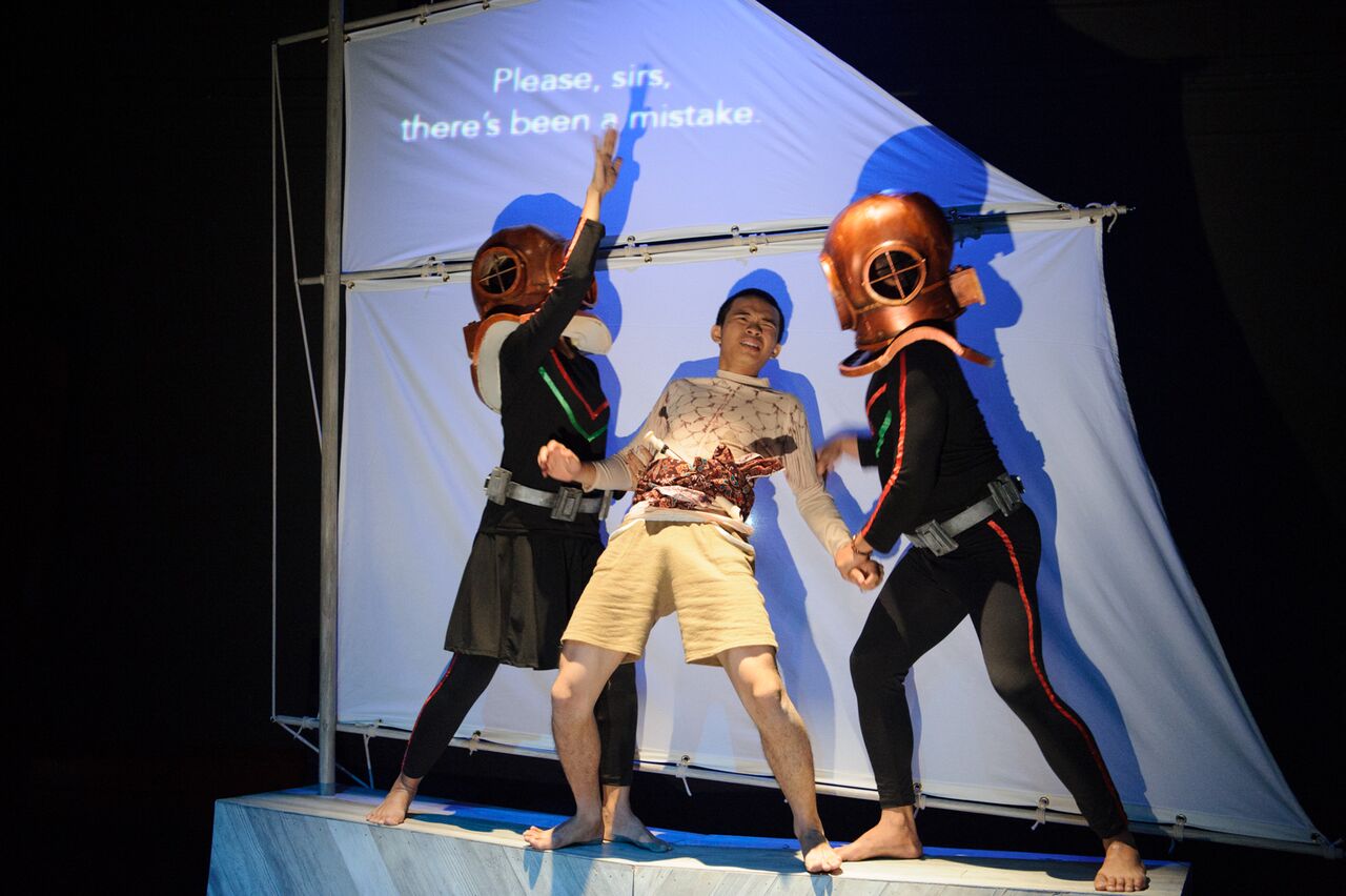 The interrogation of Indonesian fishermen in the play Cahaya Memintas Malam was one of diverse interactions devised by the student writer-actors on the broad theme of encounter with the Other. The framing story, an Indonesian folk-tale performed by the Indonesian students, depicts a poor farmer attempting to fish outside his own village area. The man is accused of killing a woman found in the stream, and is subsequently executed. When butterflies drawn by the sweet scent of the innocent man’s body block out the sun, causing crops to fail, the villagers acknowledge that they had been wrong to blame and punish the man simply because he was an outsider.