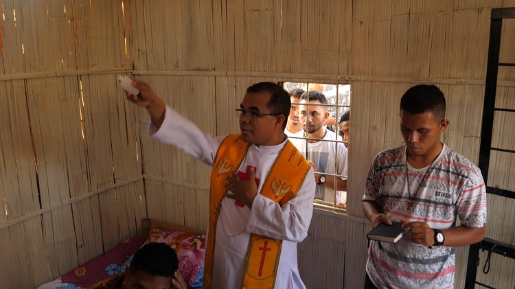 Setelah pembacaan doa, Pater Andi mengeluarkan sebuah botol kecil berisi air suci, dan memercikkannya ke segala arah di dalam kamar, dan dengan gerak cepat mengelilingi luar rumah sambil terus memercikkan air suci. Semua sanak saudara dan tetangga yang hadir menyaksikan dengan penuh perhatian. Sekembalinya ke dalam, Pater Andi lantas meletakkan kedua belah tangannya di atas kepala sang pasien, sembari membacakan doa, suara Pater Andi lembut tapi jelas. Tak ada seorangpun yang bersuara. Setelah rangkaian doa itu. Pater Andi duduk di samping sang pria. Para staf puskesmas pun berdiri dekat dan mengundang masuk nenek, kakak perempuan dan sepupunya, untuk duduk bersama di atas kasur. Sambil menggendong anak balitanya, sang kakak perempuan duduk terdiam, matanya nampak berkaca-kaca, begitu pula sang nenek. Pater Andi mengucapkan terima kasih pada mereka atas segala usaha yang dilakukan merawat pria tersebut selama bertahun-tahun. Keluarga itu mulai meneteskan air mata. Para staf puskesmas tersenyum penuh kasih.